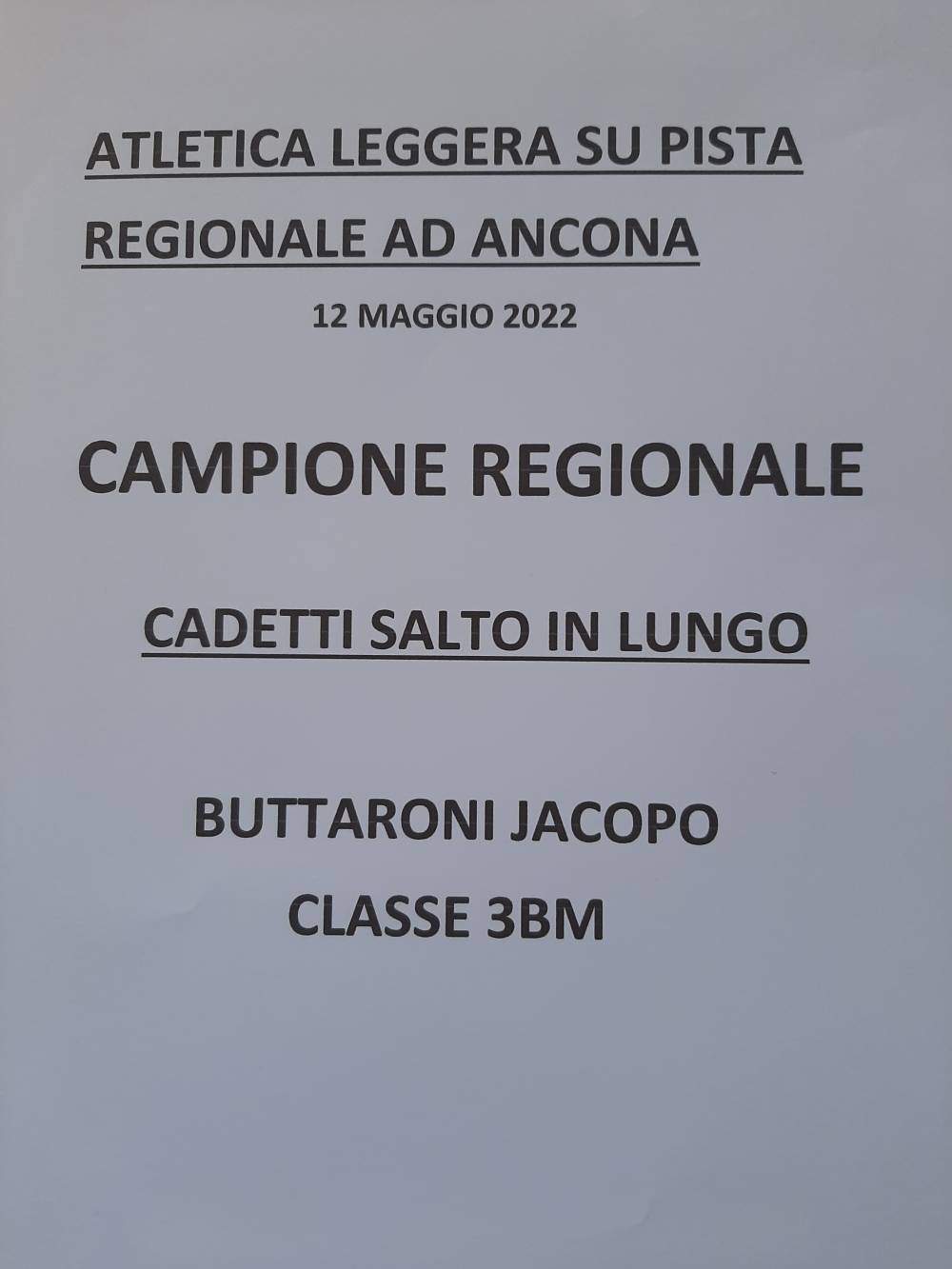 Esordisce come CAMPIONE REGIONALE del SALTO IN LUNGO categoria CADETTI l’alunno Buttaroni Jacopo.