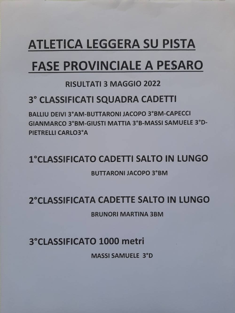 Martedì 3 Maggio 2022 si sono svolti i Campionati di atletica leggera su pista fase provinciale a Pesaro. L’impegno, la determinazione e la fatica hanno portato le due squadre maschili e femminili di Saltara e Montemaggiore a gareggiare con orgoglio e soddisfazione. Complimenti ai ragazzi del salto in lungo che parteciperanno alle gare Regionali ad Ancona ma anche a tutti gli alunni che hanno gareggiato a Pesaro.