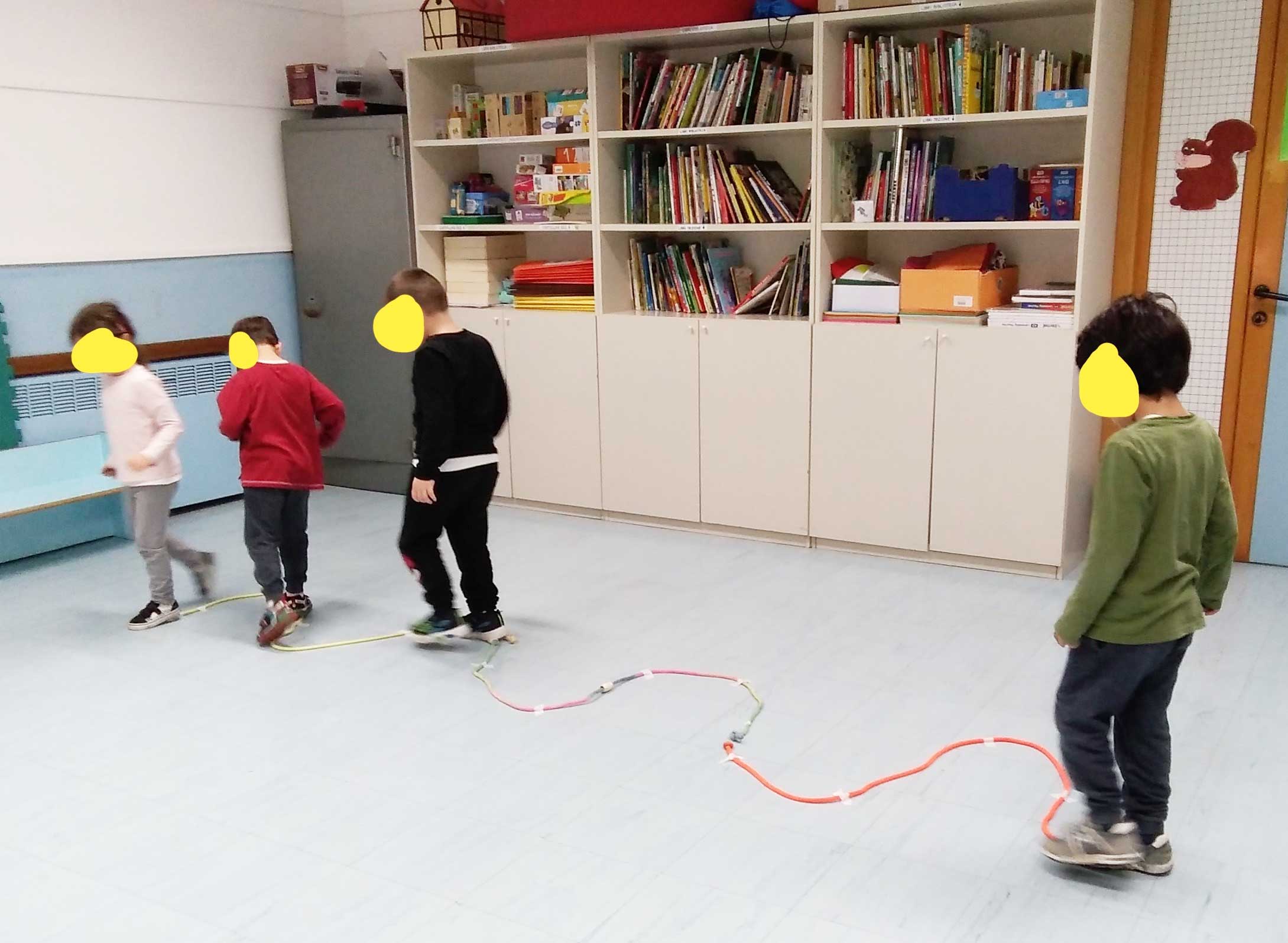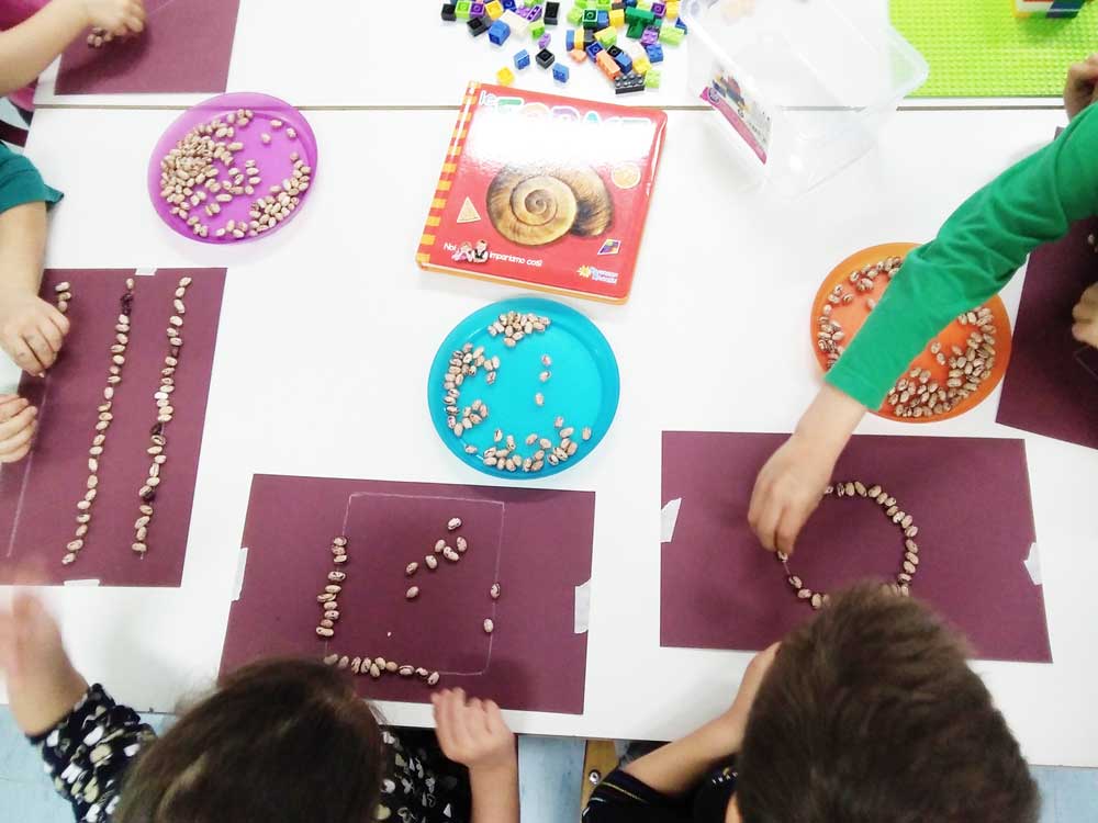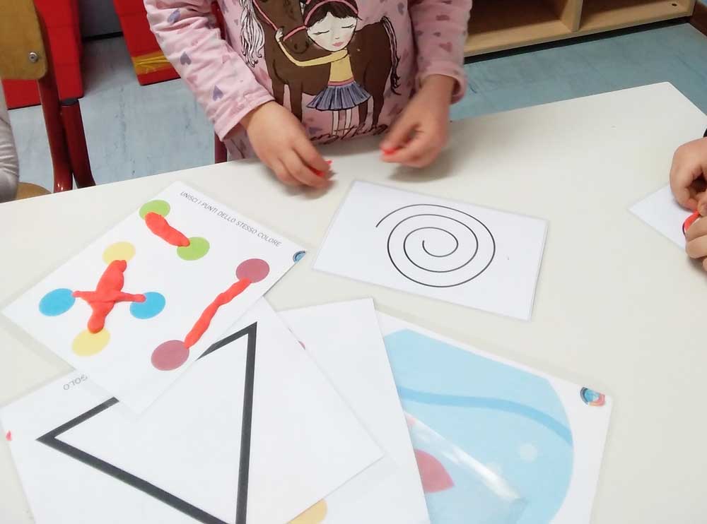 Per i bambini di cinque anni sono state previste attività mirate che, attraverso la pratica corporea e l’utilizzo di vari materiali, potessero accompagnarli verso il gesto grafico e al pregrafismo sul foglio.